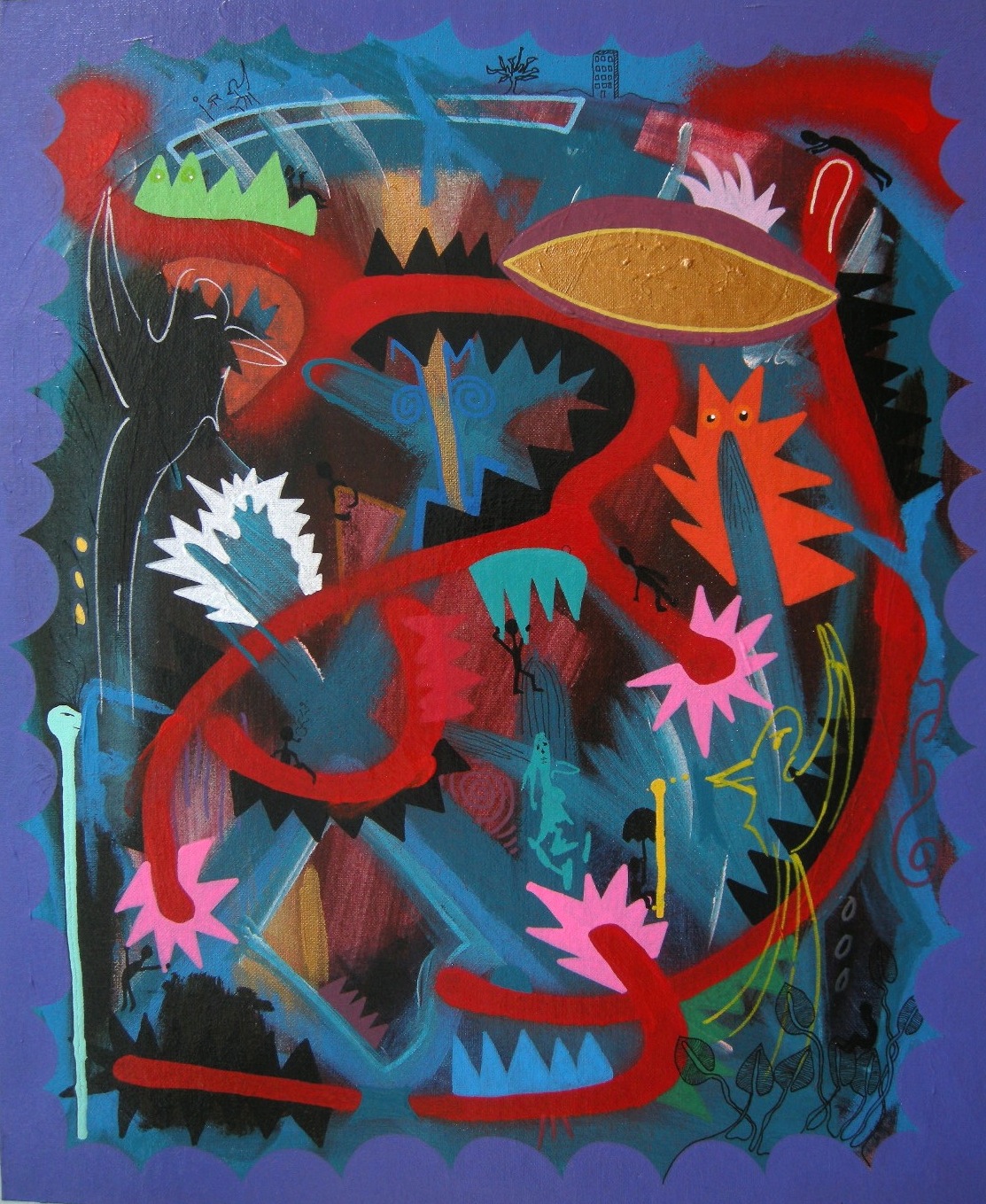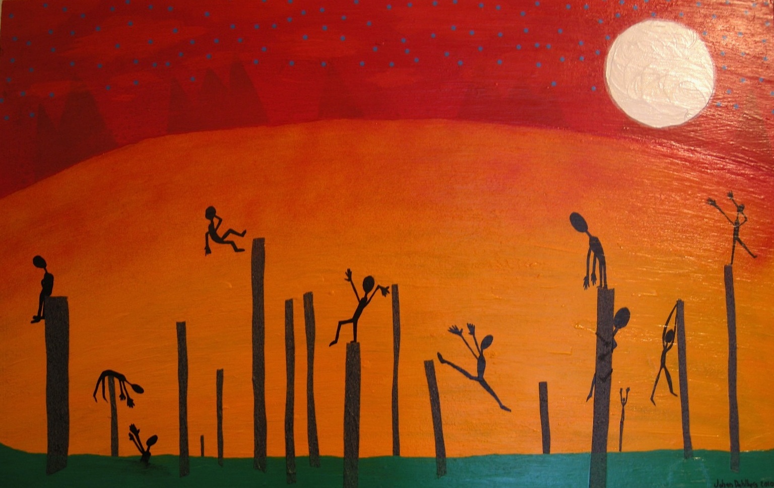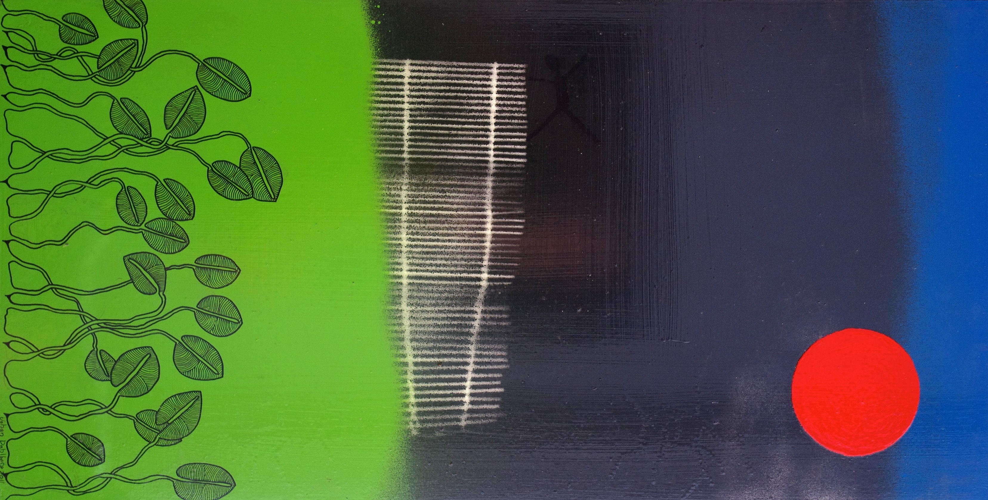 Balansakt i skymningsträdgården, akryl, spray och tusch på trä, såld