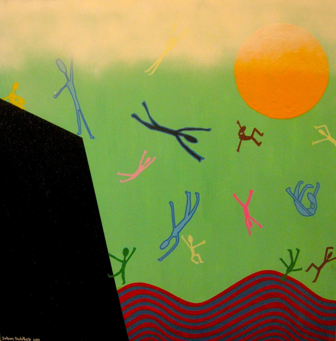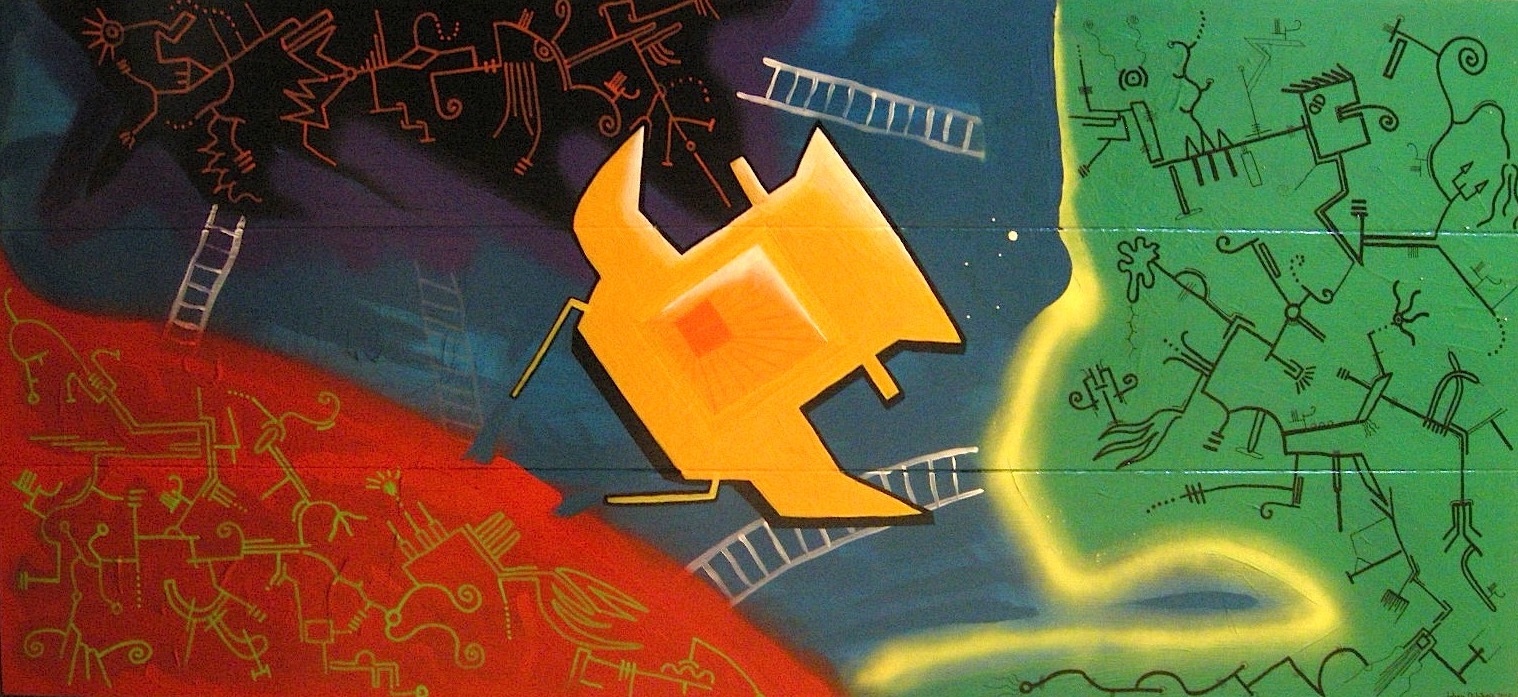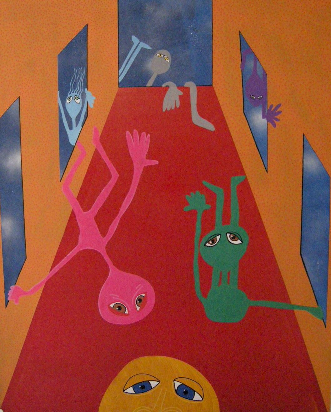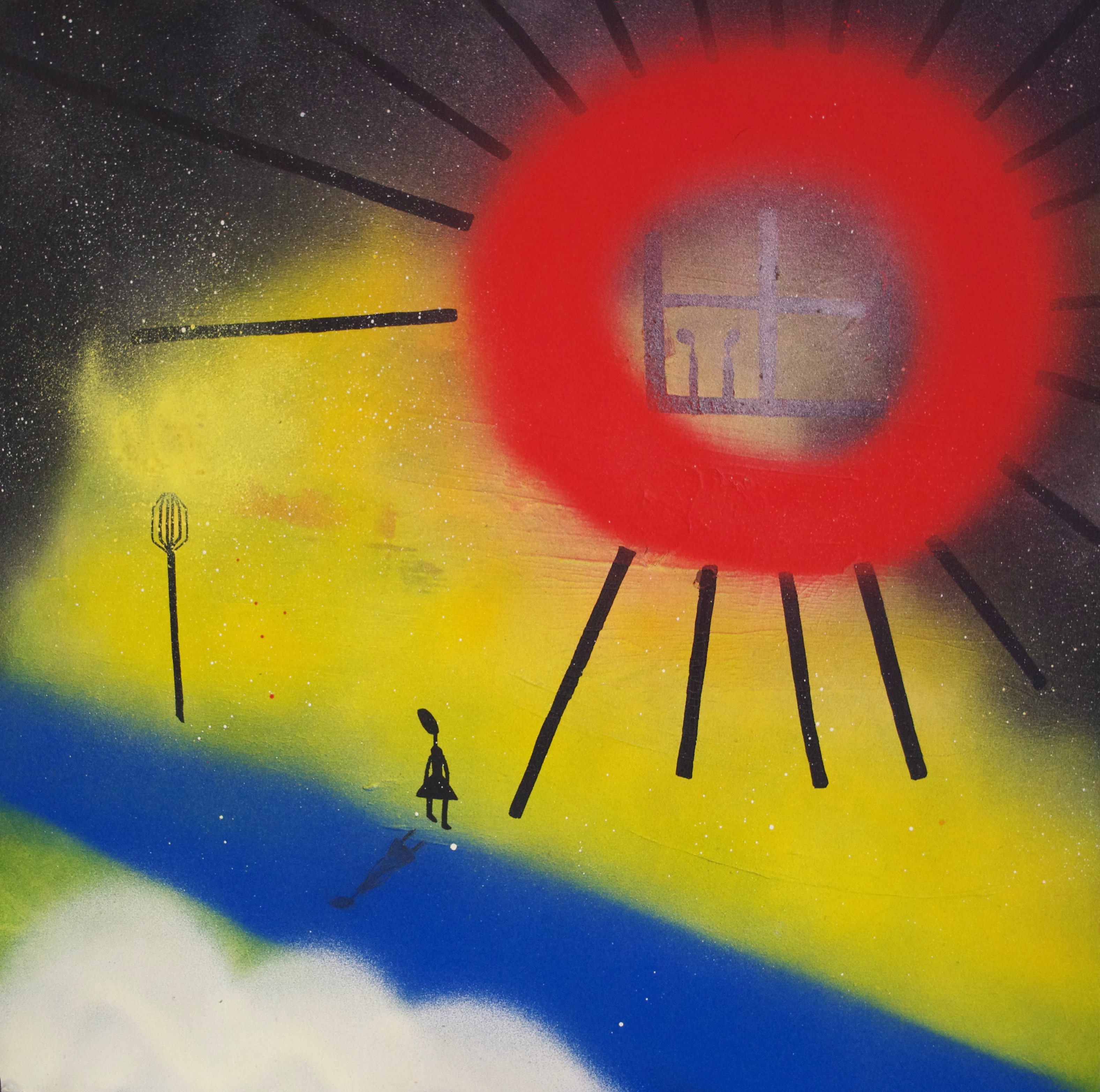 Himlens fripassagerare, 78x96 cm, akryl, spray och tusch på pannå