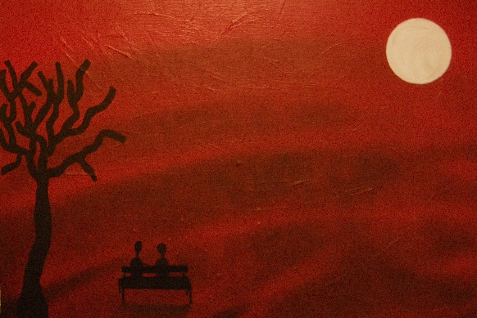 En kväll vid bänken, 54x36,5 cm, Akryl, spray och tusch på trä