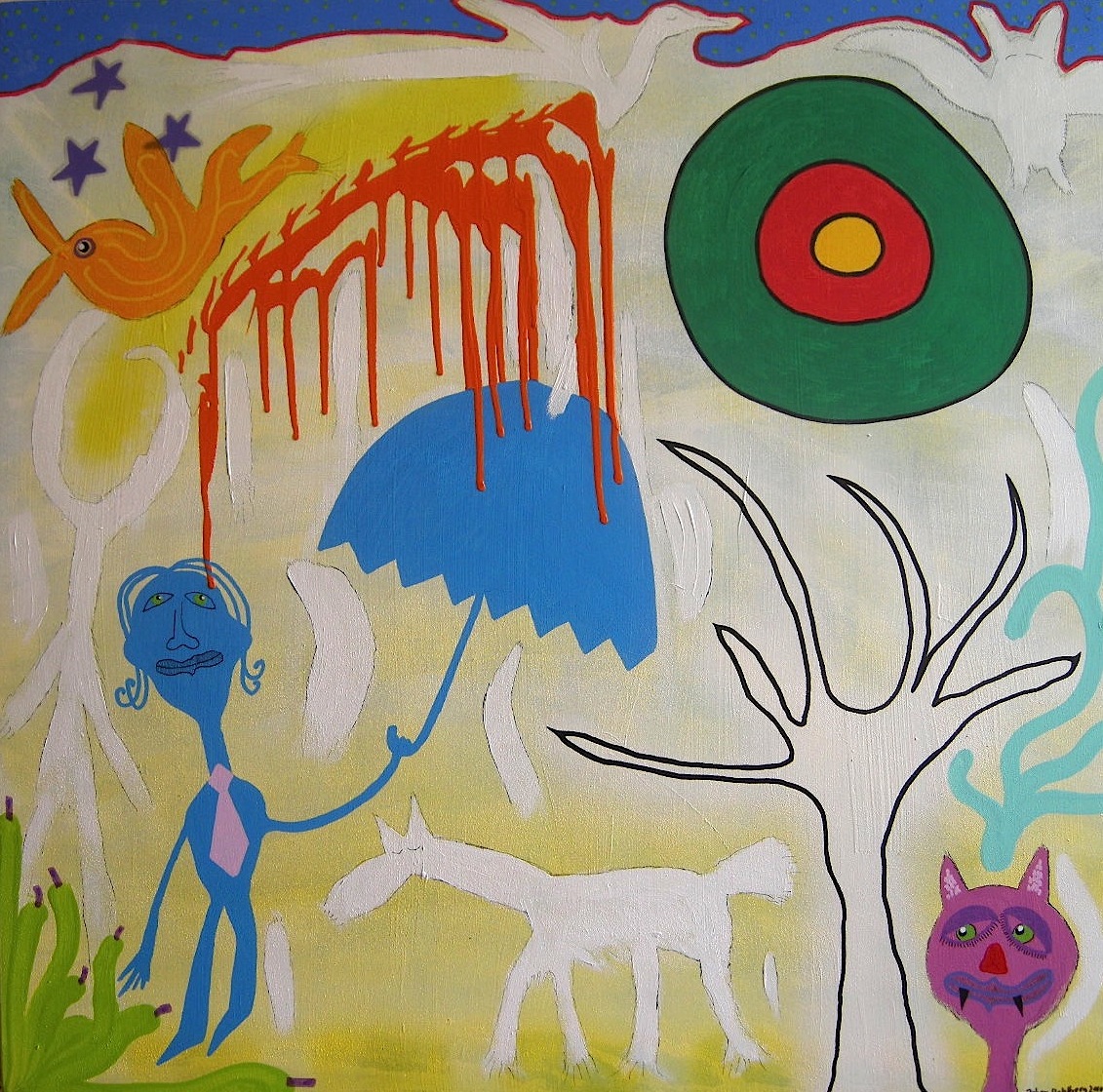 Nino dagdrömmer, 70x48 cm, akryl, spray och tusch på trä