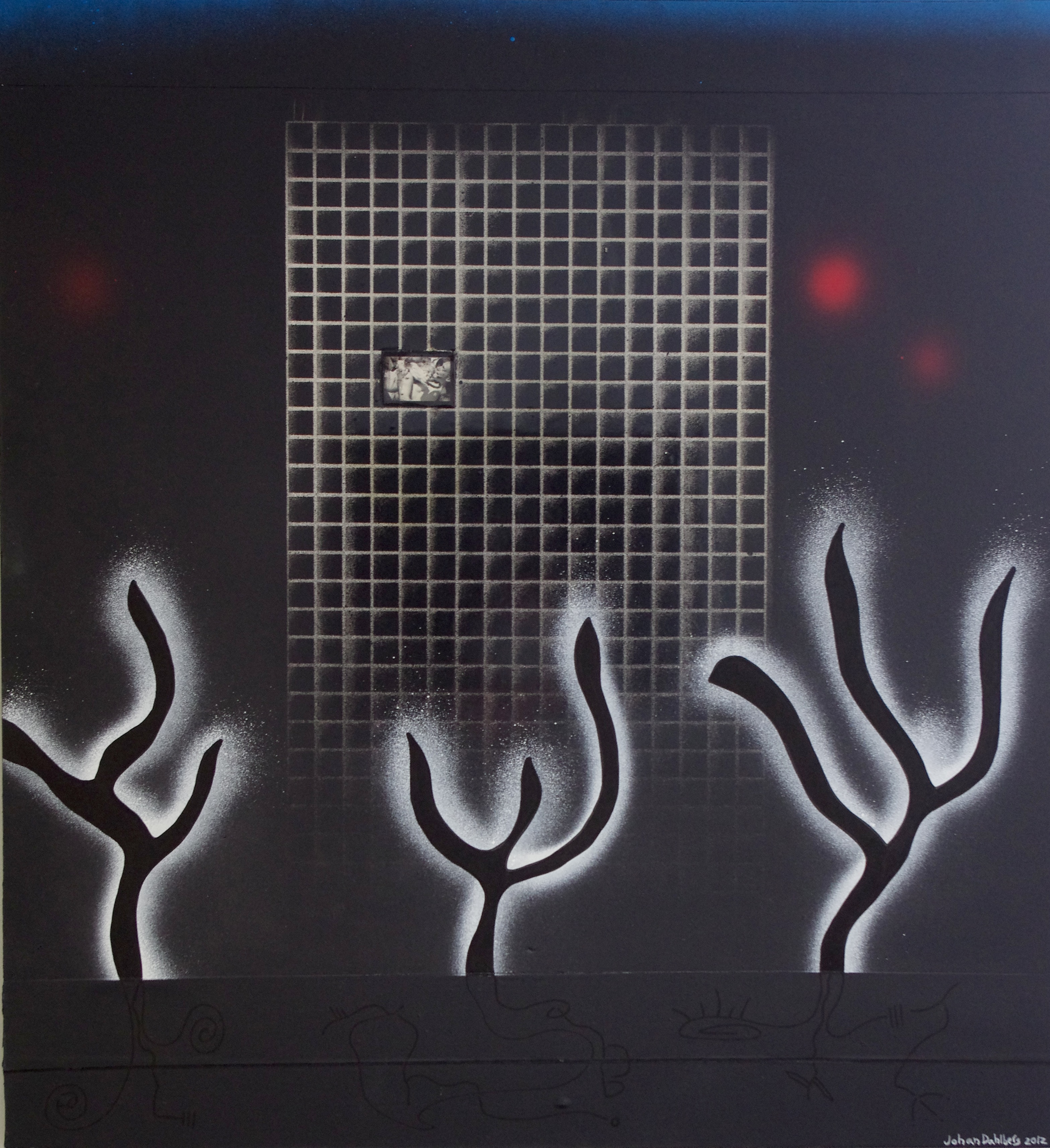 Kammarspel 1, 60×50 cm, akryl, spray och tusch på duk, såld