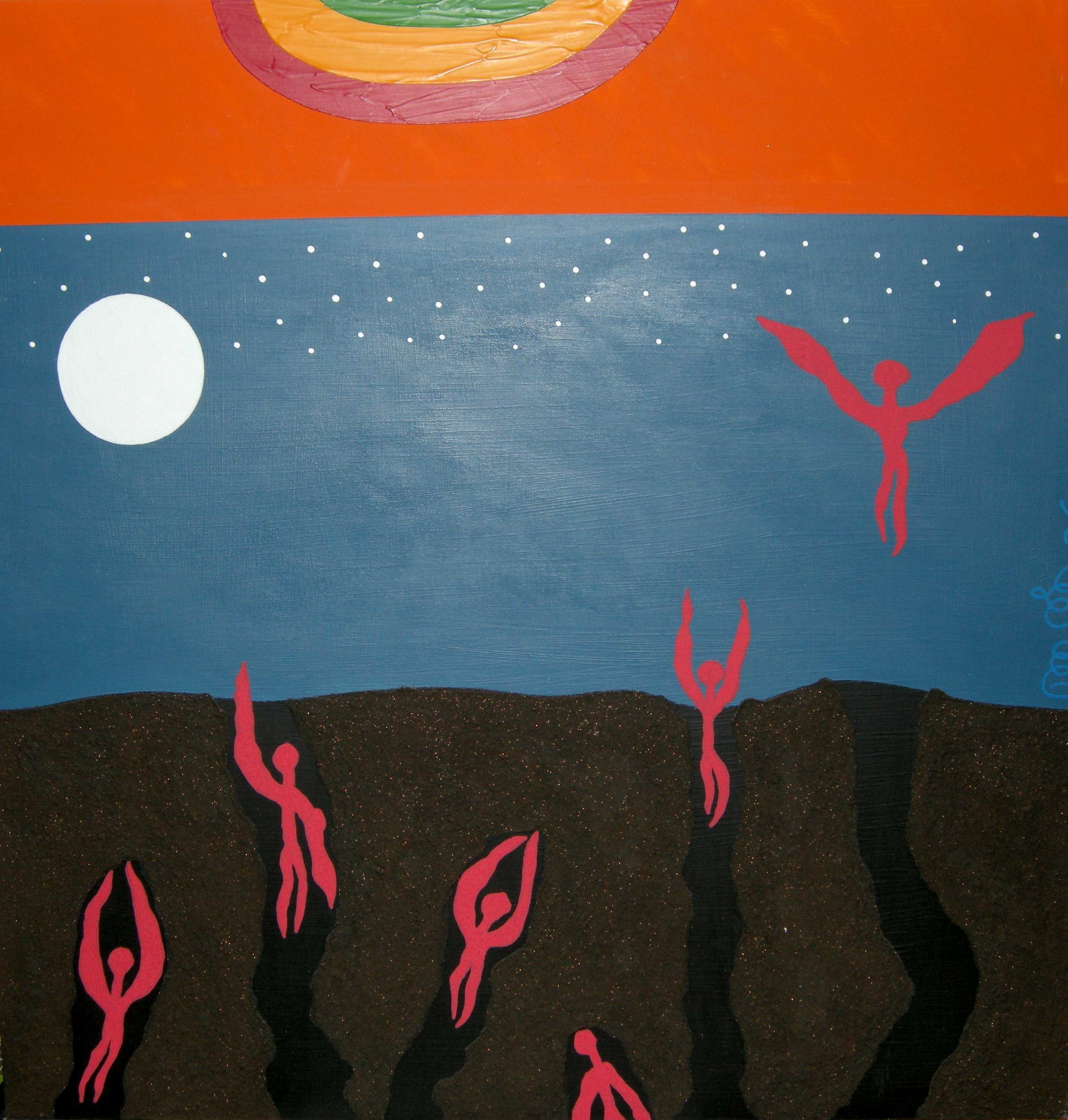 Änglar i förskingring, 50×40 cm, akryl och tusch på duk, såld