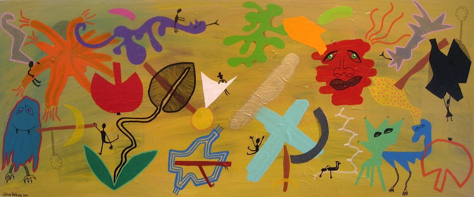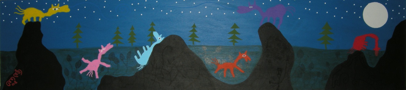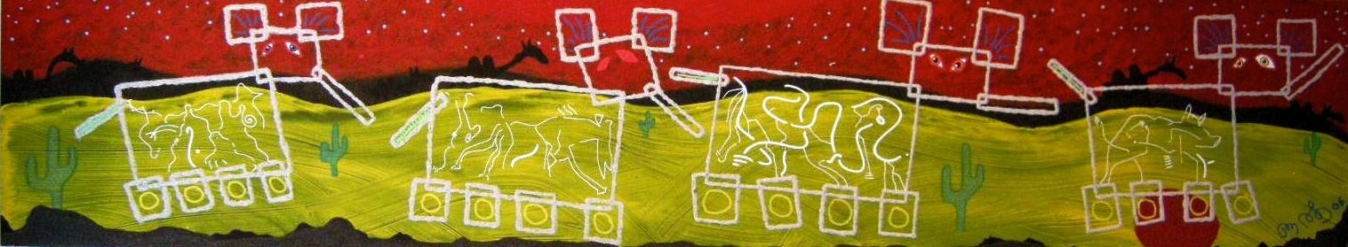 Karavan, 122x24 cm, akryl, stenfärg och tusch på trä