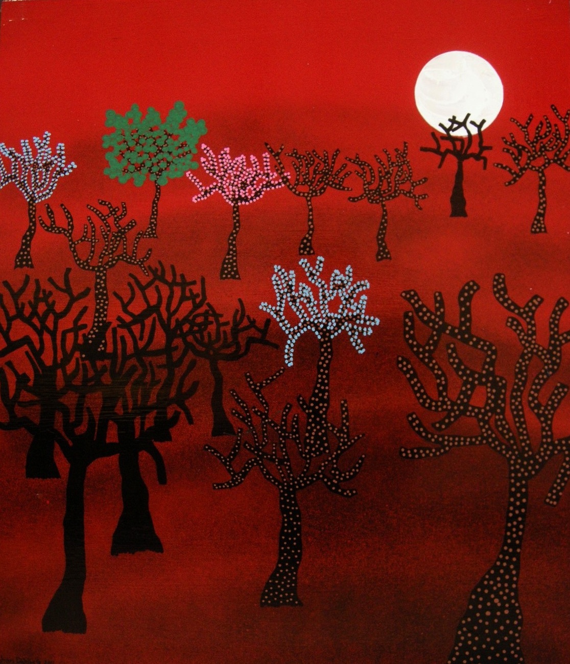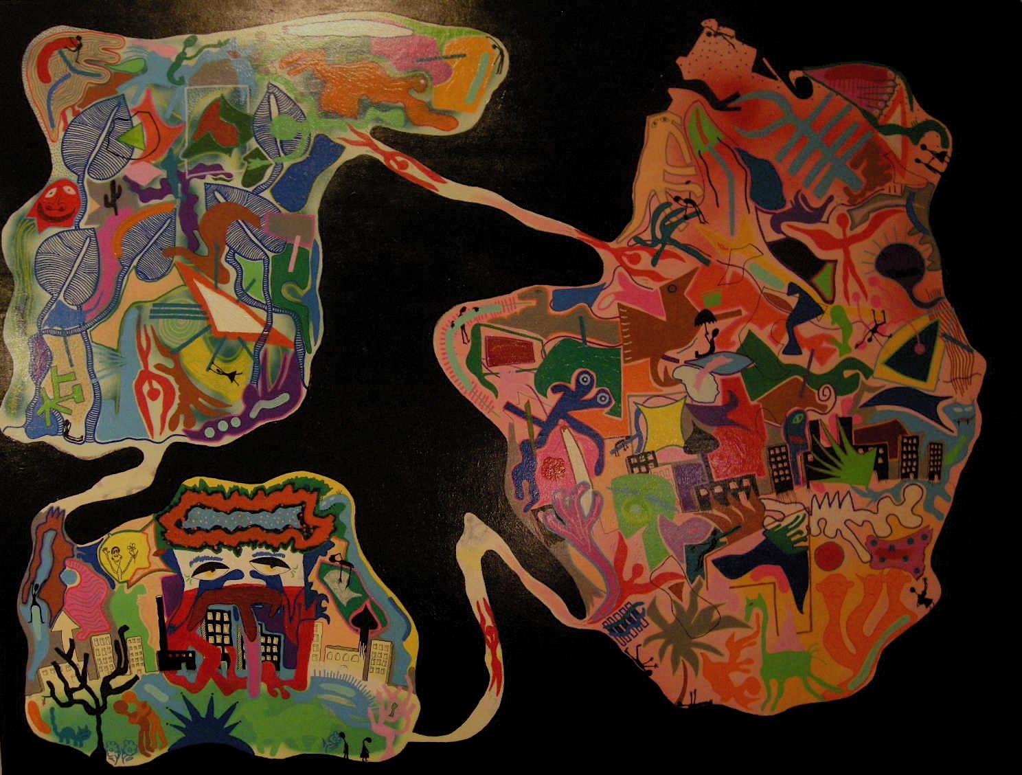 Utsikt från fröken Shikibus fönster en natt 1997, akryl, spray och tusch på trä, såld