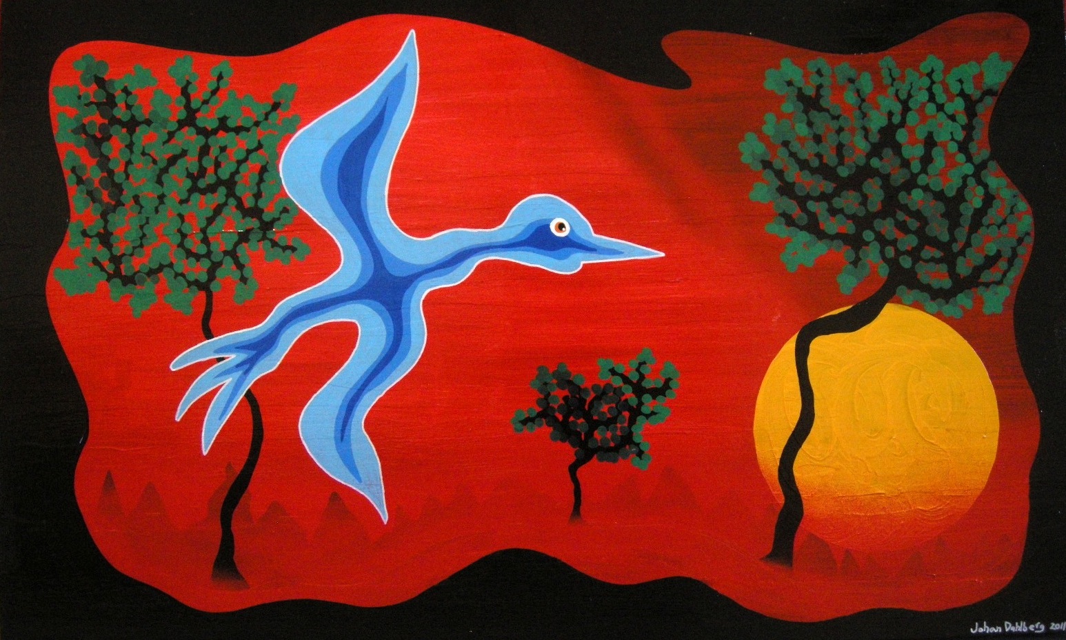 Kvällsflykt, akryl, tusch och spray på trä, såld