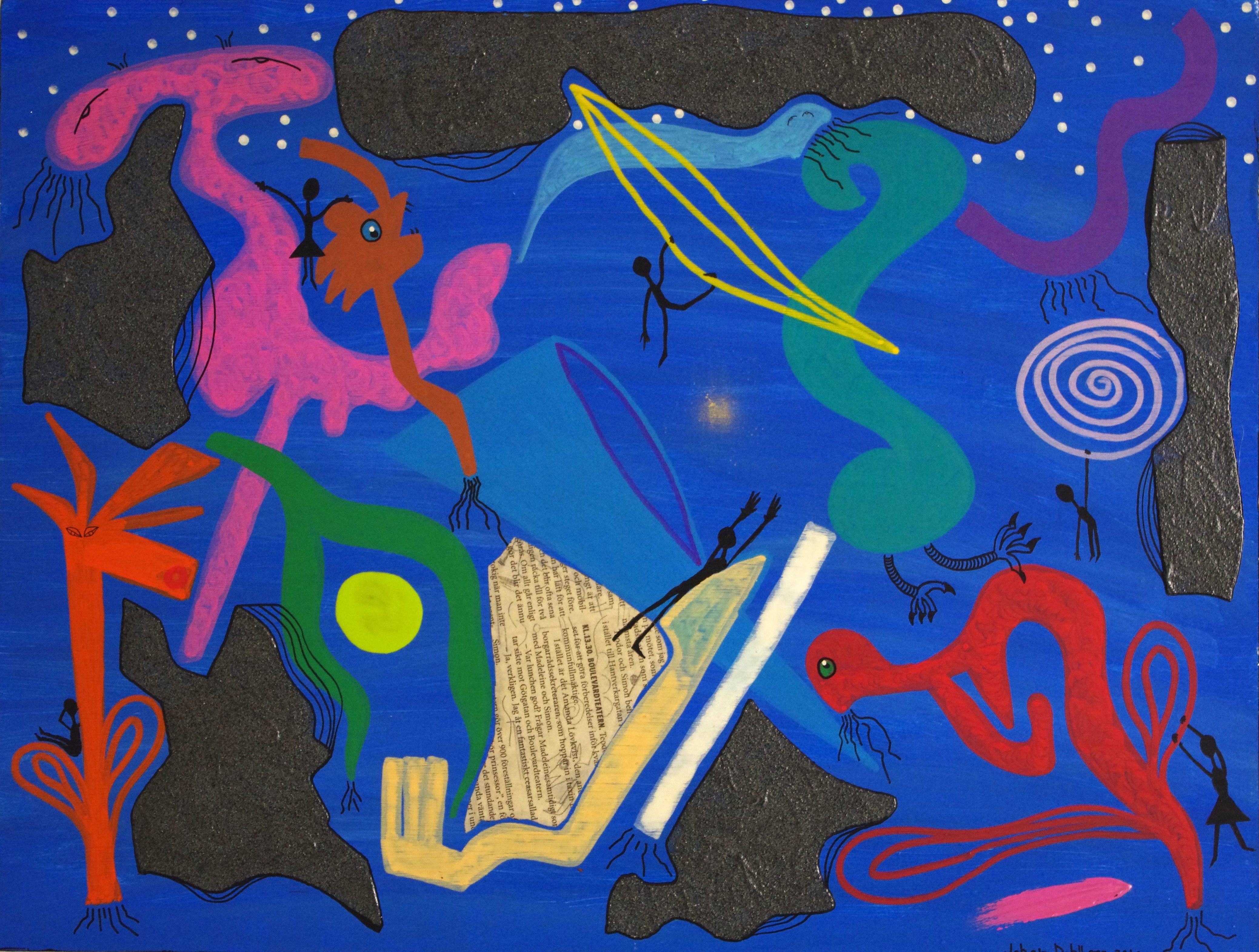 Olivia på Saturnus, 84×54 cm, akryl, stenfärg och tusch på trä