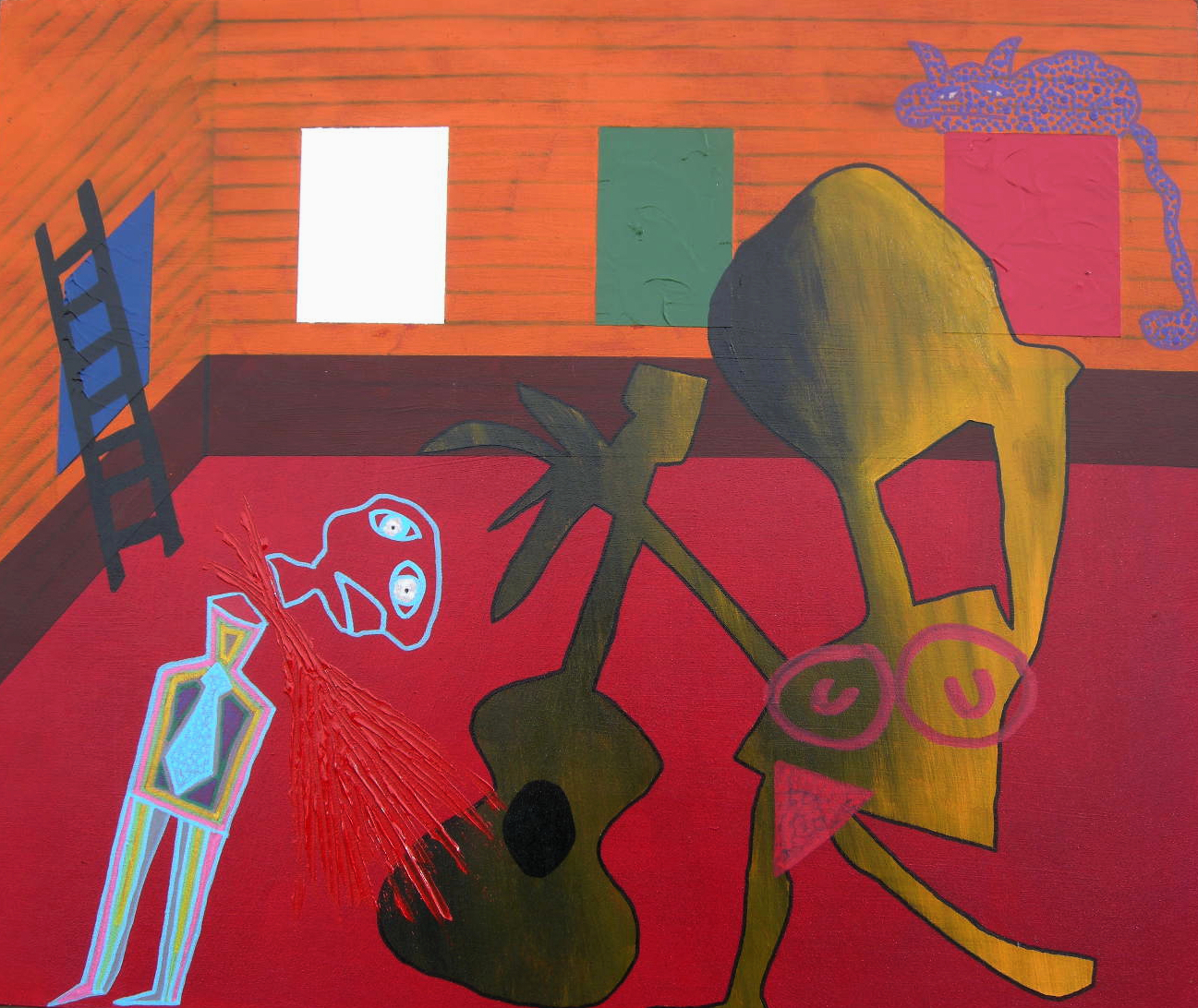Stege, katt, gitarr, 55×46 cm, akryl och tusch på pannå